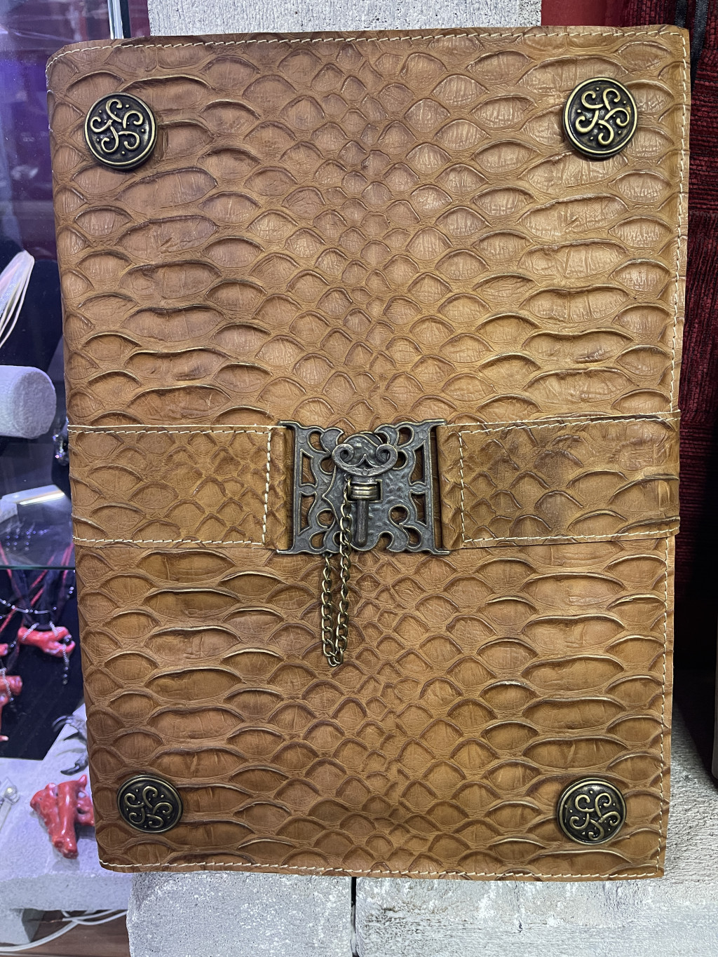 Valódi barna bőr kötésű napló, díszvarrással, középen zárható antikezüst galvanizált fém dísz. A négy sarkában 4 db fém dísszel. Méret: 40x30cm. Belül is valódi bőr borítás 200 antikolt lappal (400 oldal). Rendelhető bronzantik galvanizált dísszekkel is!