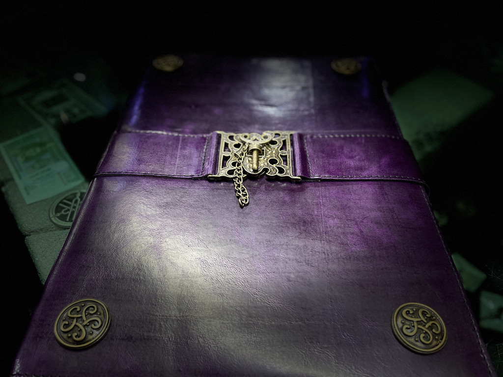 Valódi bőr kötésű napló, díszvarrással, középen zárható bronzantik galvanizált fém dísz. A négy sarkában 4 db fém dísszel. Méret: 40x30cm. Belül is valódi bőr borítás 200 antikolt lappal (400 oldal).