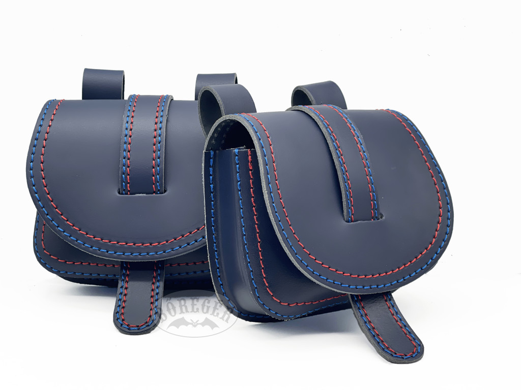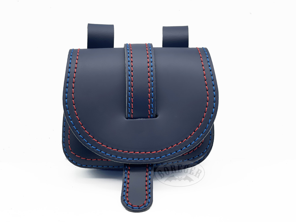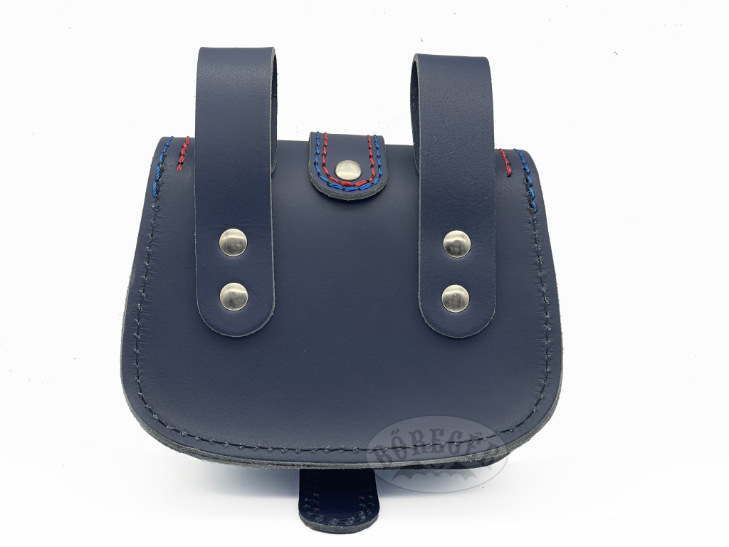 Kék színű tarsoly alakú bőr övtáska, szélein dupla díszvarrással