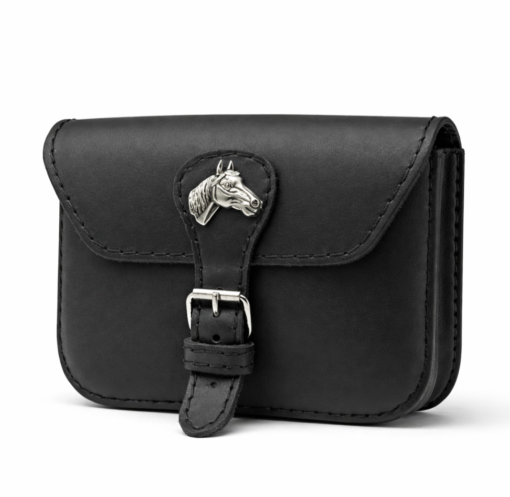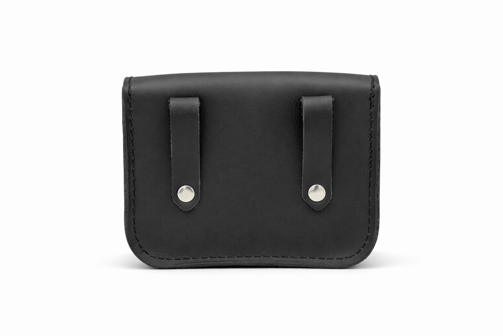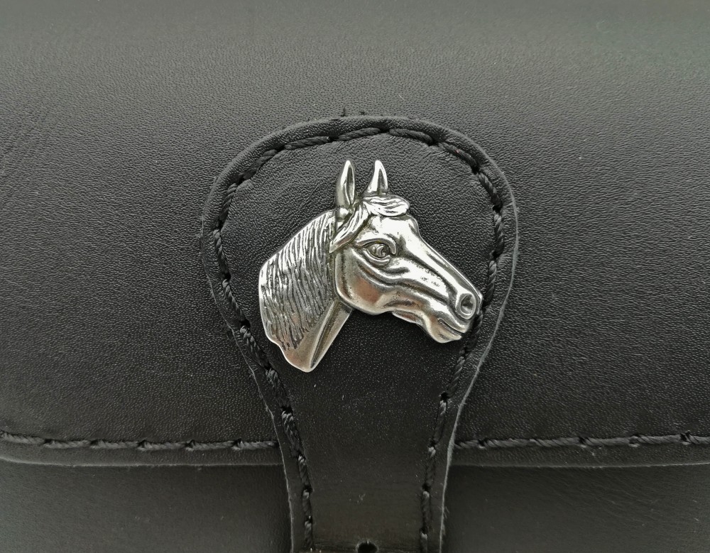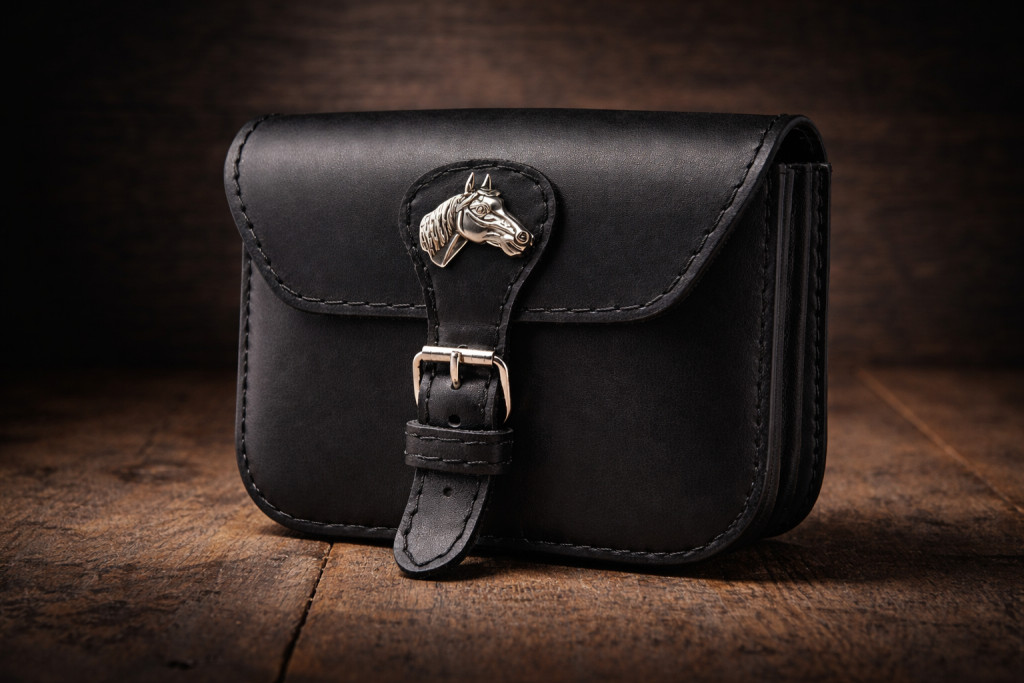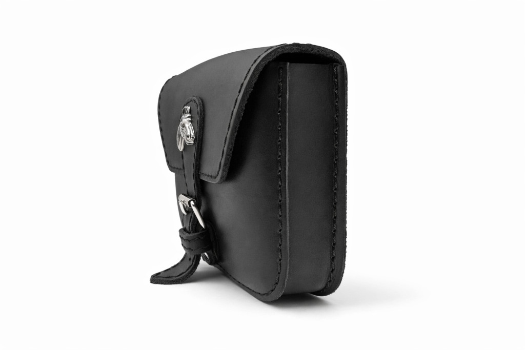 A mély fekete bőr, a precíz varrás és a kontrollált fényű fém alkatrészek időtálló, minőségi megjelenést garantálnak.