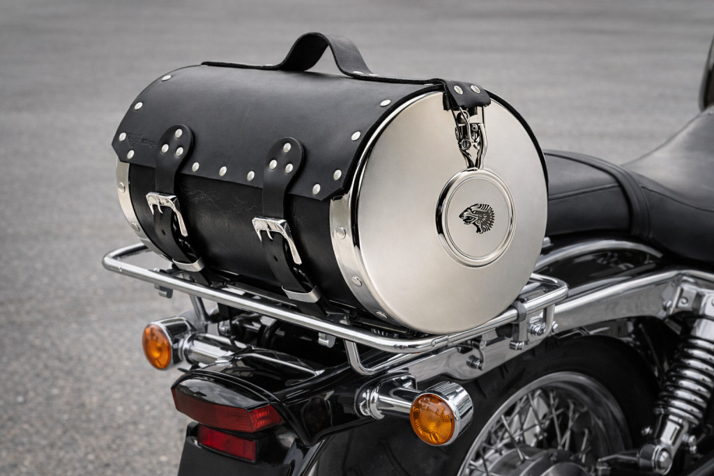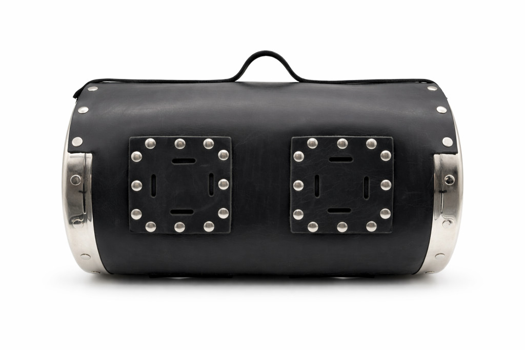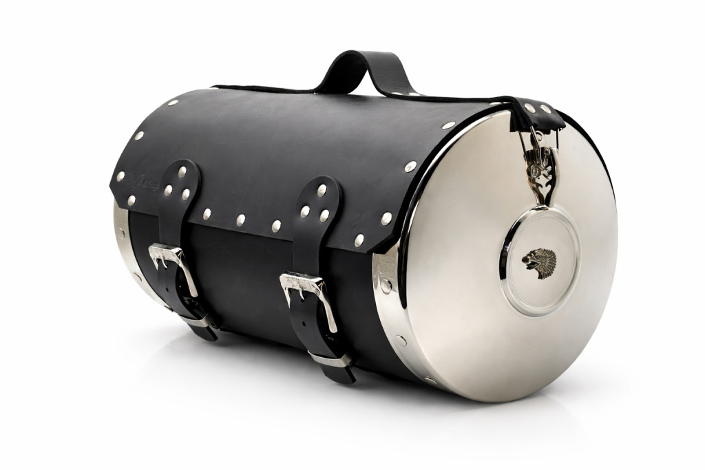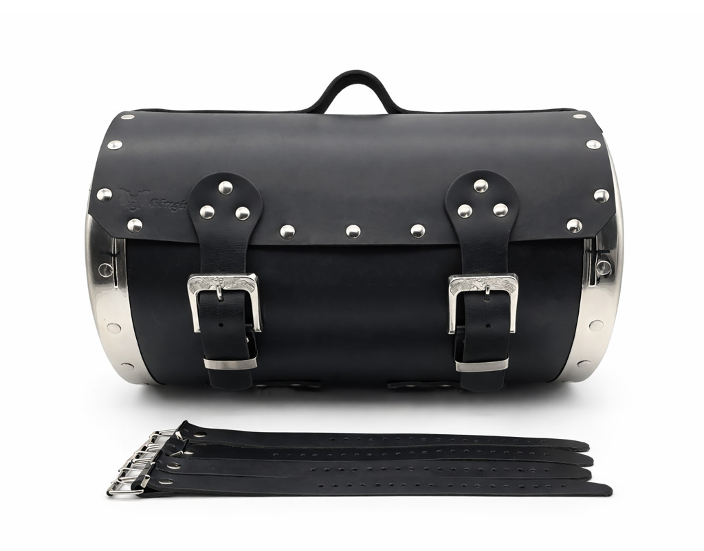 Fekete bőr hátsó hengertáska motorra – krómozott oldalakkal, sas fej dísszel (40×26 cm)